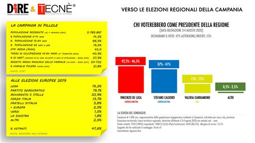 Le interviste sono state effettuate il 3-4 agosto 2020 con metodo cati-cawi contattando in totale 7.343 soggetti (100%) di cui rispondenti 1.000 (13,6%), rifiuti/sostituzioni 6.343 (86,4%), con un margine di errore di +-3,1%. A dichiarare il voto il 47% con un 53% di astenuti/incerti. La Campania, regione con una eta’ media di 43 anni, con oltre un quinto di famiglie che vivono in poverta’, un tasso di occupazione che tocca appena il 40% (40,9) e piu’ di un terzo della popolazione rappresentato dai cosiddetti ‘neet’ (dati Istat), vede quindi in vantaggio De Luca, ma con Caldoro, gia’ presidente della giunta regionale dal 2010 al 2015, che promette battaglia potendo replicare, sondaggio alla mano, il bottino del centrodestra (Lega, FI e FdI) del quasi 40% raggiunto alle scorse elezioni europee.