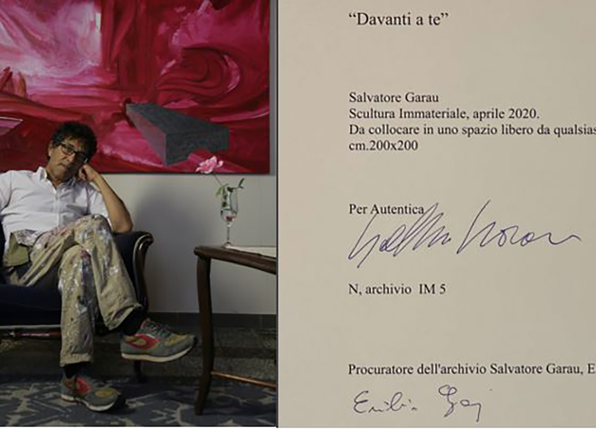 Dopo la clamorosa eco mediatica di portata planetaria, riscossa dalla vendita all'asta, la scorsa primavera, di “Io sono”, scultura immateriale di Salvatore Garau, un'altra opera “che non esiste” del maestro sardo, torna nel catalogo di una auction house. Si tratta di “Davanti a te”, che sarà battuta, martedì 12 ottobre, all'asta 4-U New Arte Contemporanea, della casa milanese Art-Rite.