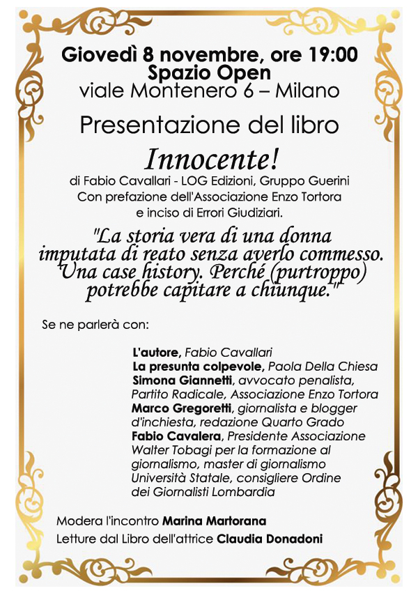 La storia vera di Paola Della Chiesa, giovane donna che ha subito il doppio ludibrio - giudiziale e mediatico - senza aver commesso alcun reato: la racconta nel libro "Innocente!" lo scrittore Fabio Cavallari (Log Edizioni). Con la prefazione dell'Associazione Enzo Tortora e, in quarta di copertina, un inciso di Errorigiudiziari.com