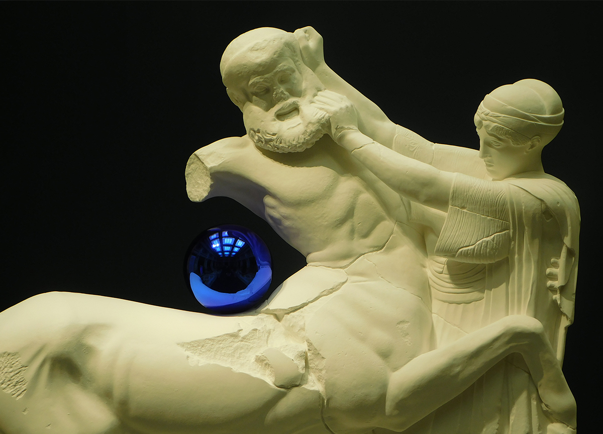 L’opera, realizzata nel 2013 e oggi parte di una collezione privata, appartiene alla serie “Gazing Balls”, un singolare ciclo di opere dove Koons replica gruppi scultorei dell’antichità per poi poggiarvi sopra delle sfere di vetro soffiato blu, tipiche decorazioni dei giardini americani di provincia. Nel caso di Centaur and Lapith Maiden, la sfera specchiante, che tradotto letteralmente dall’inglese “osserva” lo spettatore, è collocata su un calco di gesso alto oltre due metri e raffigurante la lotta fra un centauro e una donna Lapita, a sua volta ricavato da un calco ottocentesco di una parte del frontone occidentale del Tempio di Zeus a Olimpia.
