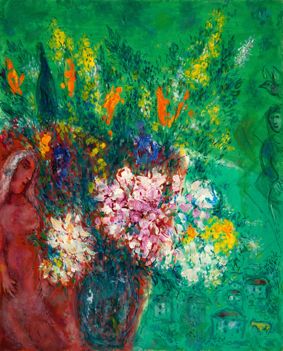 I celebri bouquet di Chagall, come Grand bouquet rouge o Bouquet de fleurs sur fond vert et rouge, non sono semplici nature morte: sono allegorie del desiderio, riflessi dell’esilio, metafore di una bellezza fragile e mai radicata. Come vasi in viaggio, evocano una vita in transito, colma di struggente vitalità.