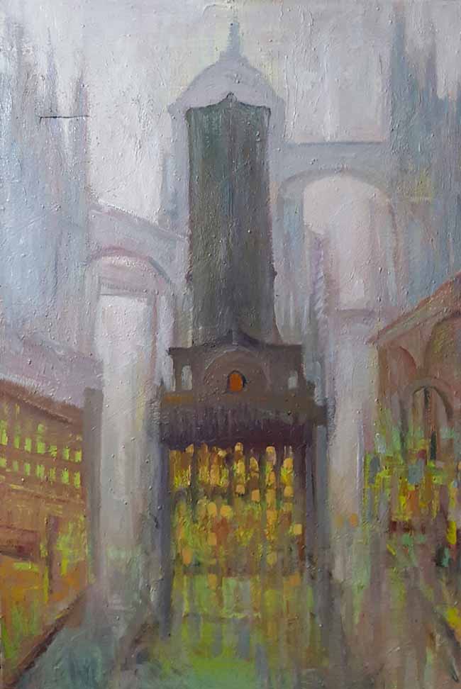 Nelle opere di Pasquale Monaco le soluzioni di spazio non si basano sulle costruzioni geometriche delle prospettive, ma sulla pura ed empirica concezione. Questo rende alcuni degli effetti meno completi, ma anche meno statici con il risultato edificante di una libertà maggiore del tratto che consente al colore di esplodere, con un’aggressività di estrazione espressionista. L’aspetto straordinario di Monaco è l’unione tra due elementi contrastanti, il tratto eccitato dionisiaco, armonizzato con la calma Olimpica che uniforma tutti i lati delle figure femminili e maschili.