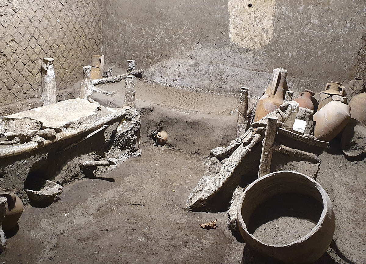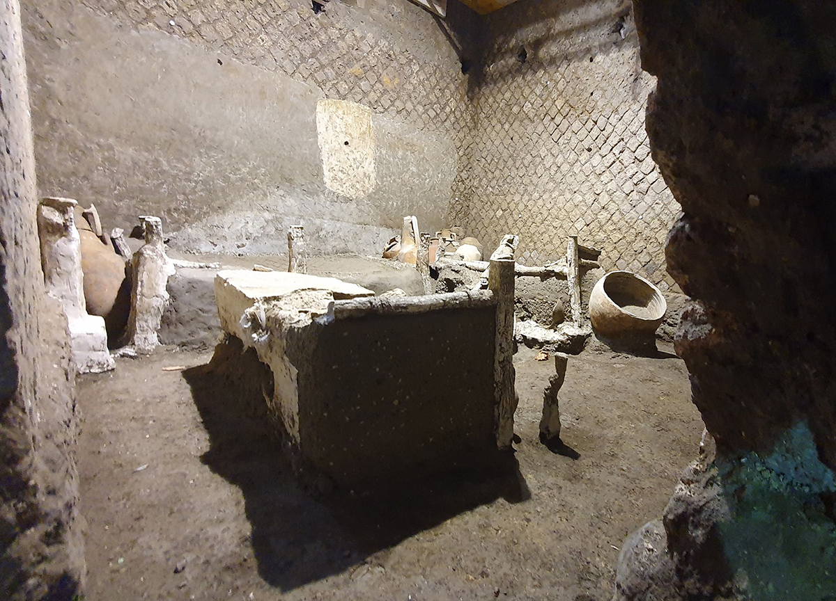 Ora gli archeologi hanno riportato alla luce una stanza destinata agli schiavi che lavoravano nella villa, che offre uno spaccato rarissimo della realtà quotidiana degli schiavi, grazie allo stato di conservazione eccezionale dell'ambiente e alla possibilita' di realizzare calchi in gesso di letti e altri oggetti in materiali deperibili che hanno lasciato la loro impronta nella cinerite che ha coperto le strutture antiche. Il rinvenimento e' avvenuto non lontano dal portico dove a gennaio scorso fu scoperto il carro ora oggetto di interventi di consolidamento e restauro.