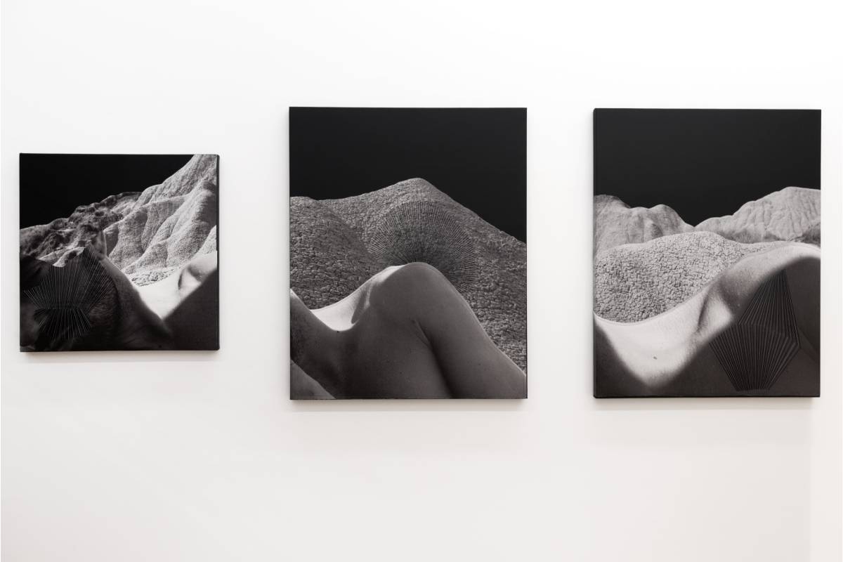 Per la prima volta l’artista cuce parti del corpo al paesaggio: il ricamo non sovrascrive, interpreta la morfologia, lavorando su collage da lei stessa realizzati. Ventagli, dorsali, costolature diventano cartografie tattili in cui corpo e paesaggio si innestano. La stampa su ecopelle non è un effetto materico: è metonimia dell’epidermide; la grana assorbe il grigio e rende l’immagine mimetica ed essenziale, quasi a chiedere di essere toccata. Così la fotografia oltrepassa sé stessa: non più superficie, ma pelle d’opera che restituisce un noi su cui il filo segna il passaggio dalla visione alla prossimità. Nel grado zero del colore — una scala di inediti grigi di Salluce che omaggia e dialoga con il nuovo lessico materico di Gaggenau (Acciaio dietro vetro fumé, il vetro antracite di Onyx e la tonalità più chiara di Sterling) — si trattengono memoria e profondità; le cuciture restano visibili e, insieme, mostrano le ragioni della loro necessità. La fotografia cucita diventa un rito laico: tiene insieme ciò che il tempo e la paura tendono a separare. Qui il paesaggio non è più sfondo, è soggetto dell’empatia. I corpi non posano davanti al mondo: vi si innestano, si conformano alla sua morfologia e ne diventano tessuto