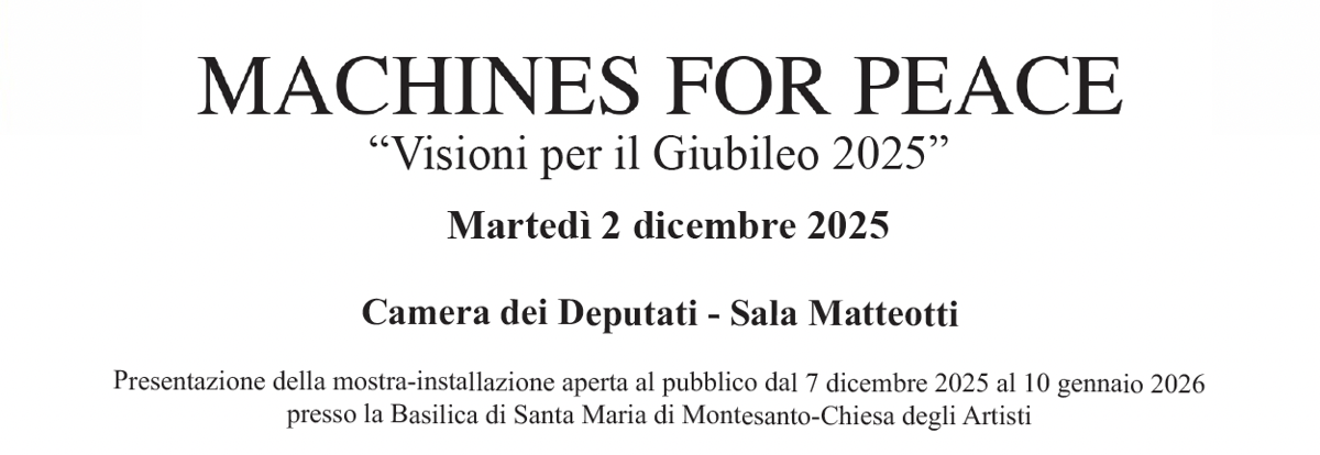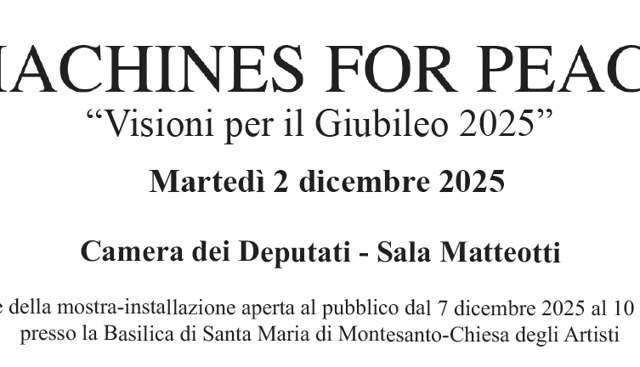 Domani, martedì 2 dicembre alle ore 15 presso la Sala Matteotti della Camera dei Deputati si terrà la conferenza stampa di presentazione dell’evento “Machines for Peace. Visioni per il Giubileo 2025”, una mostra-installazione che sarà aperta al pubblico dal 7 dicembre 2025 al 10 gennaio 2026, presso la Basilica di Santa Maria di Montesanto-Chiesa degli Artisti.