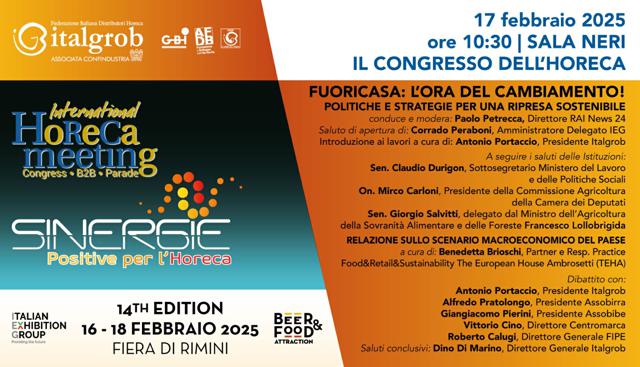 Lunedì 17 febbraio 2025, dalle ore 10.30, presso la Sala Neri, nel contesto dell’International Horeca Meeting, alla Fiera di Rimini, si terrà l’evento “Fuori Casa: l’ora del cambiamento! Politiche e strategie per una ripresa sostenibile” organizzato da Italgrob, la Federazione Italiana dei Distributori Ho.Re.Ca..