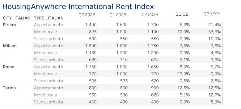 Sono Firenze e Torino a crescere percentualmente di più del resto del Paese (sia nel breve che nel lungo periodo), con entrambe le città che registrano un aumento nei prezzi degli appartamenti in affitto rispettivamente del +21% e +12,5% rispetto allo stesso periodo del 2022. A Firenze un bilocale ora costa 1.700€ al mese contro i 1.400€ dello scorso anno, mentre a Torino 900€ contro gli 800€ dell’anno scorso. Firenze è anche seconda città in Europa. dopo Lisbona, per crescita dei prezzi dei monolocali, che hanno raggiunto la sorprendente cifra di 1.100€ rispetto agli 825€ richiesti nel secondo trimestre del 2022 (+33%). Stupiscono in positivo, invece, le due maggiori metropoli italiane: a Milano negli ultimi tre mesi i prezzi diminuiscono o si stabilizzano a seconda della tipologia di immobile. I bilocali scendono a 1.750€, i monolocali sono stabili a 1200€, e si registra il -5% sulle stanze private (670€ contro i 710€ di inizio 2023). A Roma, invece, i prezzi dell’ultimo trimestre sono diminuiti per quasi tutte le tipologie di immobile: -23% sui monolocali, -8% sui bilocali, fino agli attuali 1.650€ (addirittura più bassi dei 1.750€ del 2022), e 520€ stabili sulle stanze.
