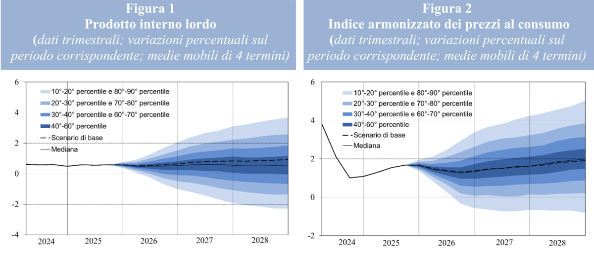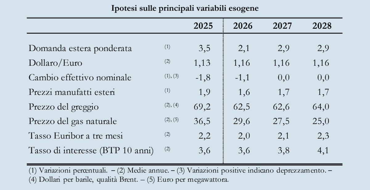 Le ipotesi sottostanti allo scenario riguardo i tassi di cambio, i prezzi delle materie prime e i tassi di interesse hanno natura tecnica e riflettono gli andamenti impliciti nelle quotazioni di mercato disponibili al 26 novembre. Lo scenario tiene conto delle informazioni disponibili sulla manovra di bilancio per il triennio 2026-28 e dell’utilizzo dei fondi europei nell’ambito del programma Next Generation EU.