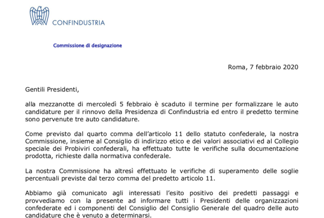"In ordine alfabetico si sono auto candidati Carlo Bonomi, Licia Mattioli e Giuseppe Pasini. Tutti risultano aver superato la soglia percentuale di appoggio da parte del 10% dei componenti del Consiglio Generale, prevista dallo statuto confederale. Carlo Bonomi ha inoltre certificato di poter disporre di un consenso che supera il 20% del totale dei voti ad oggi regolarmente esercitabili nell’Assemblea confederale, condizione che, per effetto del nono comma dell’articolo 11 dello statuto confederale, determina di diritto la sua partecipazione al voto di designazione per il nuovo presidente di Confindustria, in calendario per il prossimo 26 marzo", scrivono infatti i tre saggi di Confindustria, Andrea Bolla, Carmela Colaiacovo e Andrea Tomat, gli imprenditori incaricati dal Sistema di condurre la confederazione degli industriali italiani alla scelta del successore di Boccia, in una lettera indirizzata a tutte le associazioni territoriali, categoriali e ai membri del Consiglio generale. Lettera di cui Affaritaliani.it è entrato in possesso.