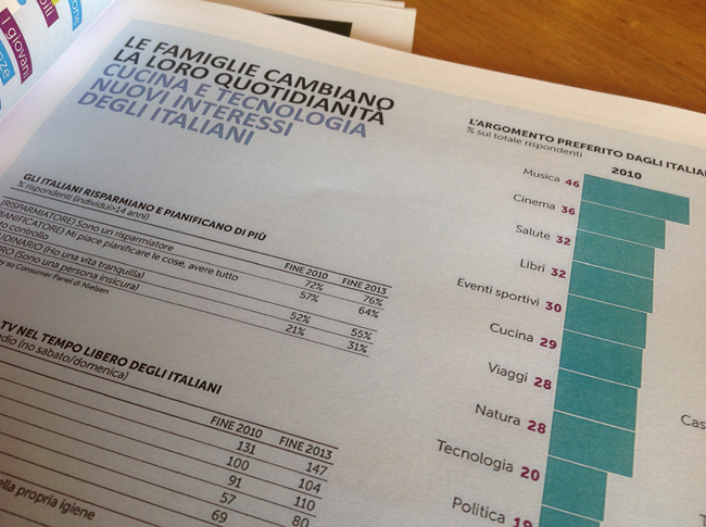 Food e digital mania- Consumi generalmente al palo ma a voler stilare una classifica svetta sul podio il binomio cucina-tecnologia: food maniaci da un lato e maniaci digital dall’altro. Sono questi i soli comparti che non decrescono in un mare di segni meno. Il cibo è in testa ai nuovi interessi degli italiani (ma solo nelle sue varianti salutistico, etico, etnico, finanche vegano) ed è l’argomento preferito di discussione: sul cibo non si litiga. E d’altronde il Made in Italy è sempre più alimentare. All’acquisto di alimenti e bevande gli italiani destinano oltre il 18% della spesa per consumi, quasi il 4% in più della media europea: più pane e pasta, più carne (anche se meno di Francia e Spagna) e più pesce (ma meno di Spagna e Portogallo). Fatta salva comunque una contrazione della spesa alimentare che dura da 13 trimestri consecutivi, gli italiani amano il cibo, ne sono ambasciatori e magari selezionano i prodotti ma mantengono alta l’attenzione sulla qualità.