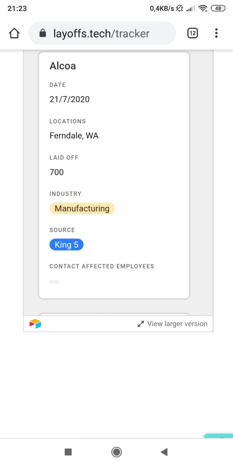 Cnbc attribuisce ad United Airlines ben 36.000 licenziamenti. Usa Today parla di 25.000 licenziamenti per American Airlines. Company Announcement ha previsto per Linkedin 960 licenziamenti. Alcoa, terzo produttore di alluminio la mondo, 700 licenziamenti. Un effetto indiretto questo del crollo dell’Automotive. E sono solo alcune delle tantissime aziende in difficoltà che layoff ha tracciato.