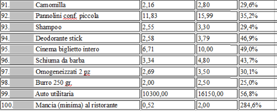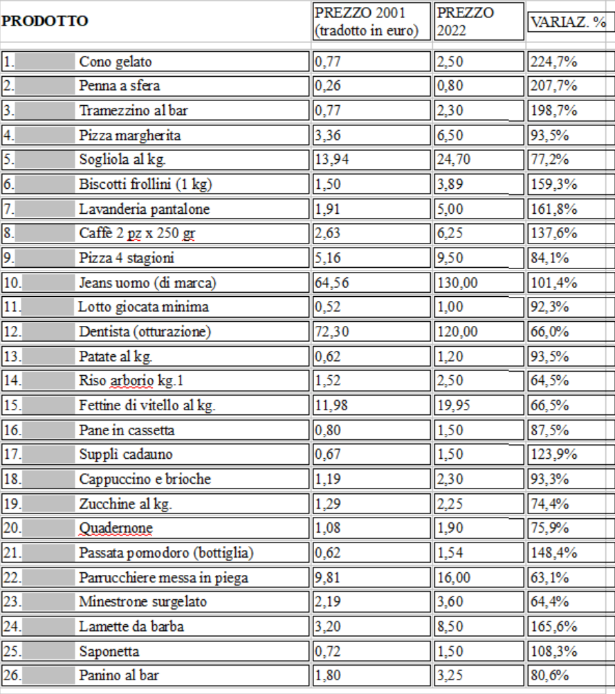 Da tempo moltissimi anni subiamo la tiritera che la BCE è il guardiano dell'euro. Alla Banca Centrale sono stati dati ampi poteri per agire in nome e per conto dell'Europa e di chi usa quotidianamente l'euro, cioè noi. Come se non bastasse a microfoni aperti pontificano il sacro 2%, che di scientifico non ha nulla, ora solo per fare un esempio di quello che dicono e forse non fanno ho volutamente riportato una tabella Indagine mette a confronto i prezzi in Italia dalla lira (2001) ad oggi (consumerismo.it) che mette in risalto tutte le variazioni su 100 prodotti di uso quotidiano: