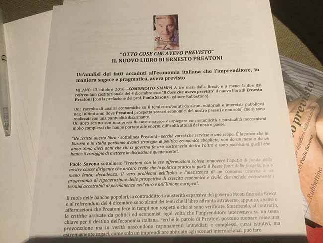 A tre mesi dalla Brexit e a meno di due mesi dal referendum costituzionale del 4 dicembre esce "Otto Cose che avevo previsto" il muovo libro dell'imprenditore Ernesto Preatoni, con la prefazione del professor Paolo Savona (Editore Rubbettino).