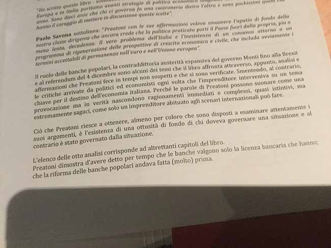 Il ruolo delle banche popolari, la contraddittoria austerità espansiva del governo Monti fino alla Brexit e al referendum del 4 dicembre sono alcuni dei temi che il libro affronta attraverso, appunto, analisi e affermazioni che Preatoni fece in tempi non sospetti e che si sono verificate. Smentendo, al contrario, le critiche arrivate da politici ed economisti ogni volta che l'imprenditore interveniva sun un tema chiave per l'economia italiana. Perché le parole dell'imprenditore possono suonare come una provocazione ma in verità nascondono ragionamenti immediati e complessi, quasi istintivi, ma estremamente sagaci, come solo un imprenditore abituato agli scenari internazionali può fare.
