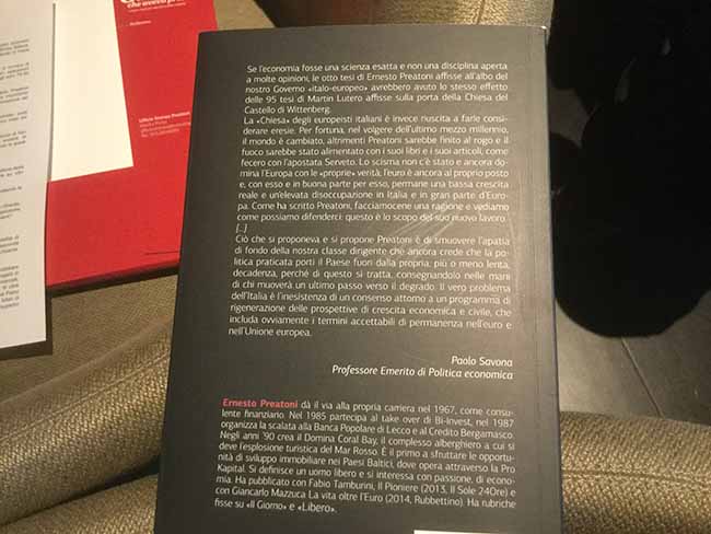 "Ho scritto questo libro - sottolinea Preatoni - perché vorrei che servisse a uno scopo. E' la prova che in Europa e in Italia portiamo avanti strategie di politica e conomica sbagliate, non da un mese o da un anno. Sono dieci anni che chi ci governa fa una castroneria dietro l'altra e sono pochissimi quelli che hanno il coraggio di mettere in discussione queste scelte".