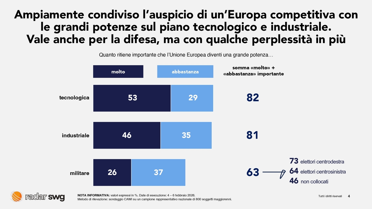 Diverso, invece, il giudizio sulle aree dove l’Europa è chiamata ad agire come attore unitario e come potenza: politica estera comune, pianificazione industriale e difesa. Qui i pareri critici risultano più presenti e l’opinione pubblica segnala, in sostanza, che c’è ancora molto lavoro da fare. La consapevolezza più diffusa è che, per restare competitiva nello scenario globale, l’Europa debba rafforzarsi innanzitutto come potenza industriale e tecnologica, allo stesso livello dei principali player mondiali. Sulla difesa le esitazioni sono maggiori, ma la maggioranza ritiene comunque necessario rendere l’Ue competitiva anche su questo fronte.