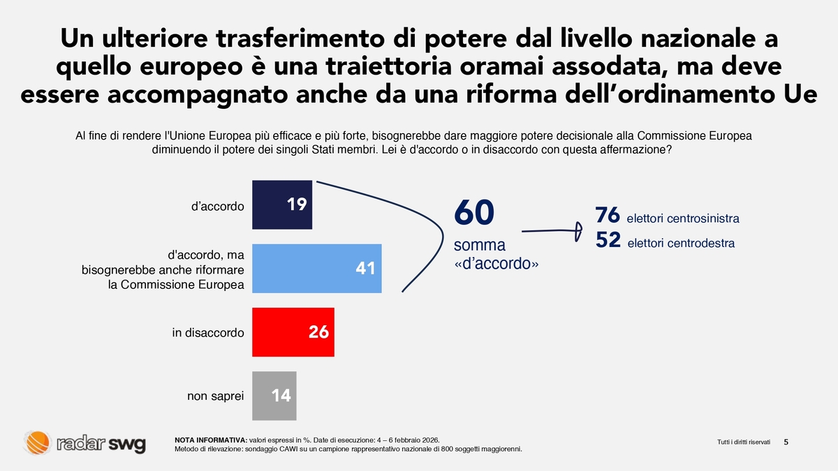 Accanto alla valutazione dei risultati e delle priorità strategiche, emerge poi un tema di metodo: per rafforzare il ruolo dell’Unione, è maggioritaria la convinzione che occorra trasferire maggiori poteri decisionali dagli Stati membri alla Commissione europea. Una parte rilevante dell’opinione pubblica, tuttavia, lega questo passaggio alla necessità di riformare l’organo per renderlo più efficace e adeguato alle nuove sfide.
