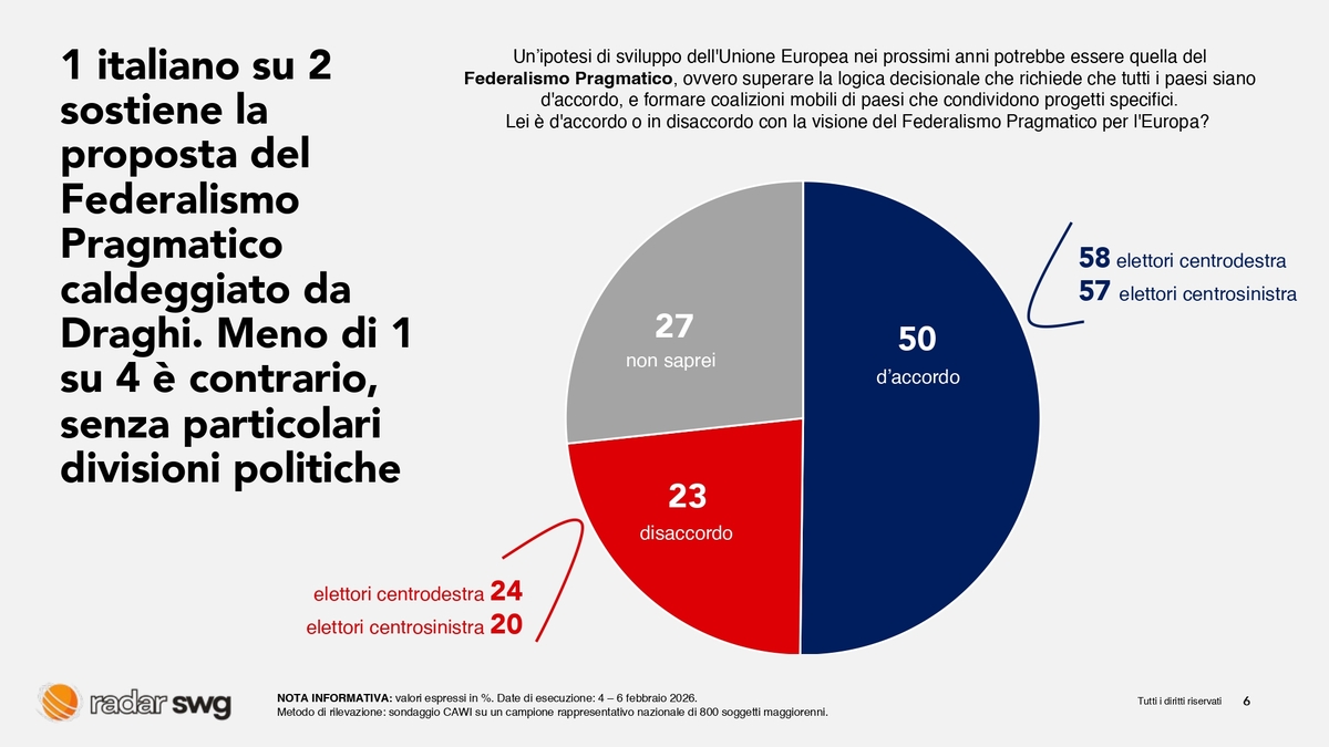 La richiesta complessiva è quindi quella di un’Europa più forte e più in grado di decidere. In questo contesto, la proposta del “Federalismo pragmatico” — l’idea di procedere per coalizioni di Paesi su progetti concreti e su aree specifiche, superando il vincolo dell’unanimità — raccoglie il sostegno di circa metà degli italiani, segnalando una disponibilità significativa verso soluzioni di integrazione più operative e meno bloccate dai veti incrociati. A questo proposito, la soluzione del Federalismo Pragmatico proposta da Draghi ottiene il supporto della metà degli italiani.