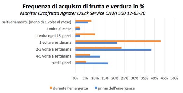 Infatti, l’acquisto di ortofrutta 2 o più volte la settimana, compreso anche chi la fa tutti i giorni, passa dal 67,6% degli intervistati prima dell’emergenza, al 32,4% durante la stessa, mentre una volta alla settimana o più raramente si muove all’opposto.