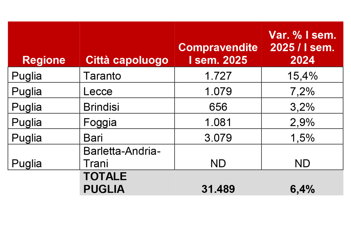 Nei primi 9 mesi del 2025, il mercato immobiliare residenziale in Italia continua a mostrare segnali di dinamismo, raggiungendo 548.287 compravendite (+9,1% rispetto allo stesso periodo dello scorso anno). Anche la Puglia ha registrato un aumento delle compravendite del +6,4% rispetto allo stesso periodo dell’anno precedente, un dato che però posiziona la regione al 15° posto per variazione percentuale. Ma quali sono le città capoluogo con il mercato residenziale più attivo nella regione?