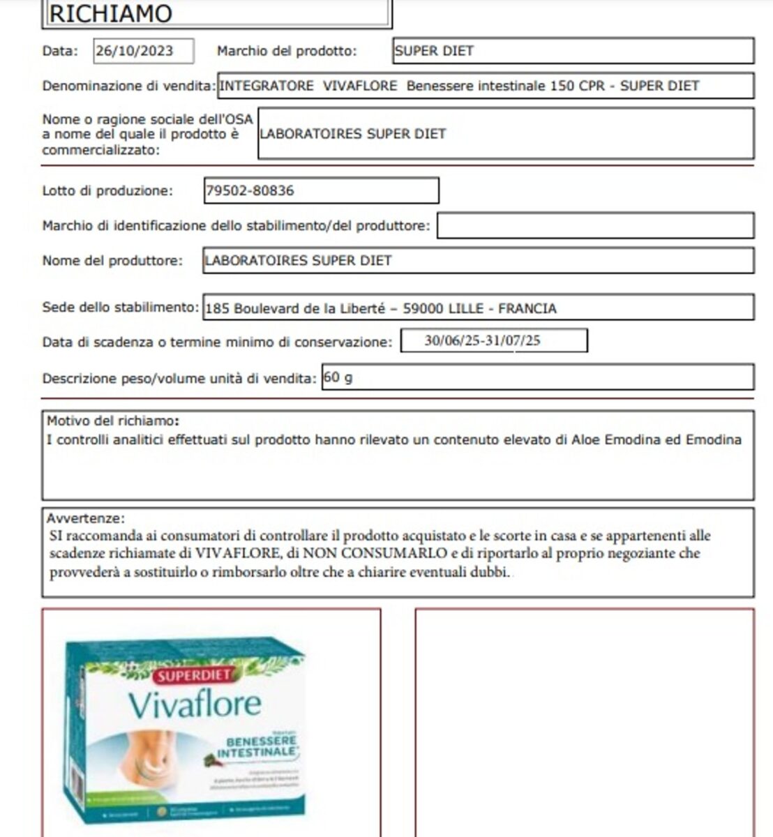 Di seguito riportiamo tutti i dettagli sul richiamo pubblicato dal Ministero della Salute. Iniziamo col dire che il prodotto è il seguente: “Integratore Vivaflore Benessere intestinale 150 CPR – Super Diet“. Il marchio del prodotto è ‘Super Diet‘, mentre il nome o la ragione sociale dell’OSA a nome del quale il prodotto è commercializzato è Laboratoires Super Diet. Anche il nome del produttore è Laboratoires Super Diet. Lo stabilimento è sito a Lille, in Francia, ed esattamente a: 185 Boulevard de la Liberté – 59000.