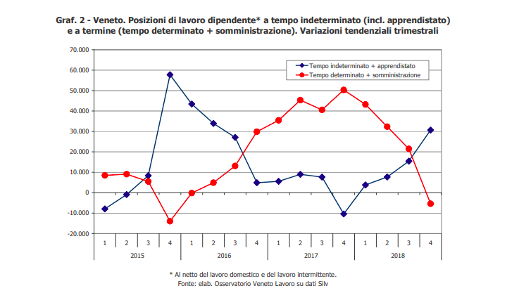 Come si legge nel documento di Veneto Lavoro "la dinamica positiva dei contratti a tempo indeterminato nel 2018 risulta dovuta: al buon andamento, lungo tutto l’anno, delle assunzioni a tempo indeterminato (+15.000 circa, al netto dell’apprendistato); e, ancor di più, alla crescita intensa delle trasformazioni, raddoppiate rispetto all’anno precedente (60.000 contro 30.000). Esse hanno raggiunto nel quarto trimestre 2018 un’incidenza sul totale delle attivazioni di rapporti di lavoro a tempo indeterminato (assunzioni + trasformazioni) prossima al 50%".