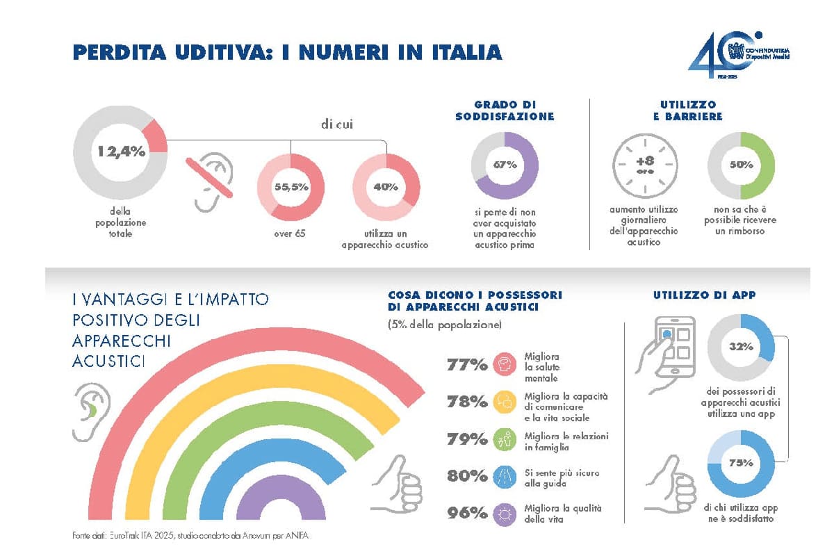 In Italia oltre 7 milioni di persone, pari al 12,4% della popolazione, convivono con una perdita uditiva. È la percentuale più alta tra i principali Paesi europei, ma il dato è accompagnato da un segnale positivo: cresce la consapevolezza sull’importanza di intervenire e di utilizzare soluzioni tecnologiche avanzate. Secondo i dati di EuroTrak Italia 2025, la ricerca condotta da Anovum per conto di EHIMA, l’associazione europea dei produttori di apparecchi acustici, e presentata a Rimini in occasione del XXI Congresso della Federazione Italiana degli Audioprotesisti-FIA, oggi il 40% delle persone che hanno riscontrato un calo dell’udito utilizza un apparecchio acustico, un dato in aumento che avvicina l’Italia a Francia e Germania.