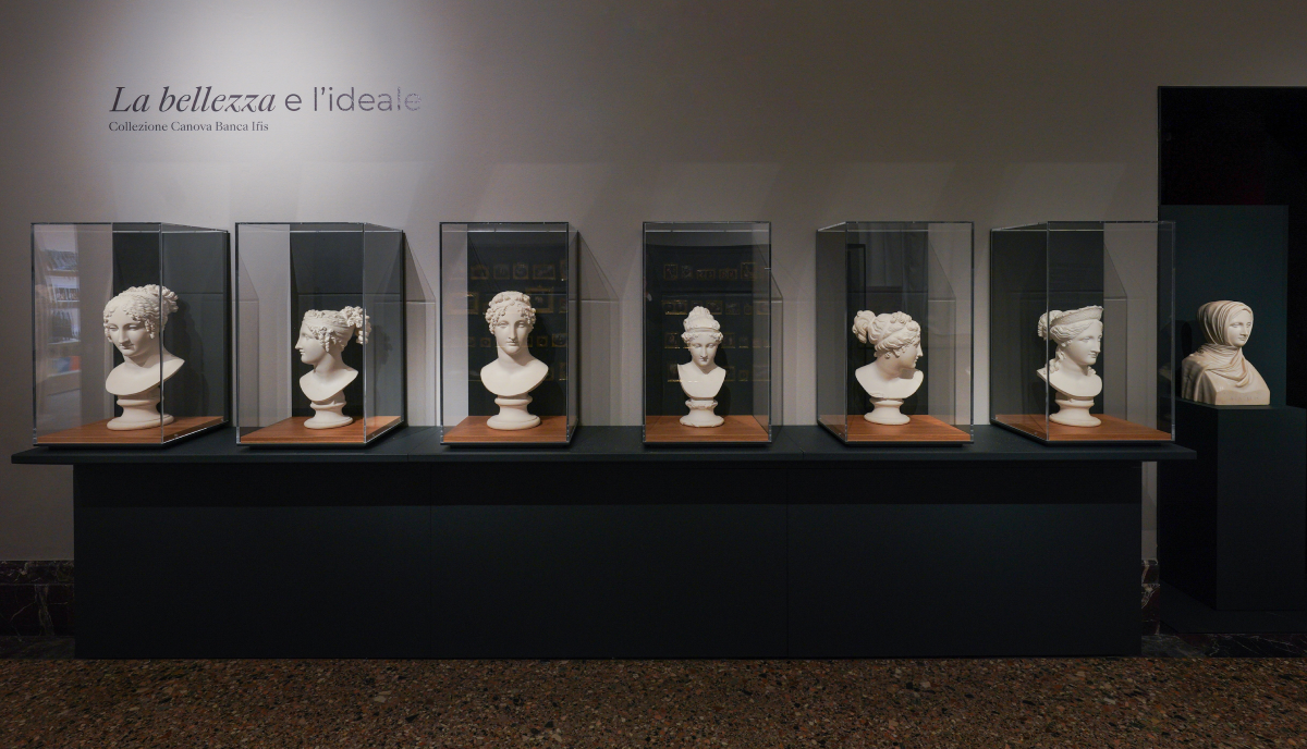 I busti esposti, creati tra il 1807 e il 1818, sono stati rinvenuti all’interno di Villa Canal alla Gherla, in provincia di Treviso. Le sculture, che misurano tra i 50 e i 60 centimetri, sono state restaurate su iniziativa di Banca Ifis. Due di esse, Paride e Beatrice, presentano le “répere”, piccoli punti metallici utilizzati nello studio di Canova per trasferire le misure dal modello in gesso al marmo. Le opere raffigurano soggetti iconici del maestro veneto, come Ebe, Tersicore, Venere italica, la personificazione della Pace, e diversi ritratti femminili della famiglia Bonaparte: Paolina Borghese, Carolina Murat, Elisa Baciocchi Bonaparte e Letizia Ramolino Bonaparte.