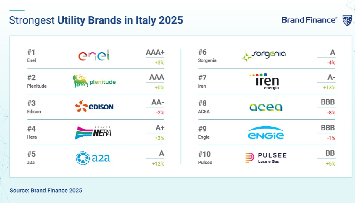 L’edizione 2025 dell’analisi mette in evidenza il rafforzamento di quei marchi che vantano una lunga storia nel mercato, come Enel, Iren, A2A ed Hera. Al contrario, aziende più recenti nate nel contesto della liberalizzazione del settore, come Plenitude e Sorgenia, pur mantenendo una buona performance, mostrano segnali di stabilizzazione o lieve arretramento. Dopo aver espresso in passato livelli di forza del brand superiori rispetto alla loro quota di mercato, queste ultime sembrano ora trovarsi in una fase di consolidamento.Brand Finance, società leader mondiale nella valutazione di brand e asset intangibili, effettua regolarmente analisi che uniscono metriche finanziarie e di marketing, osservando in maniera sistematica la performance economica, la reputazione e l’immagine dei principali marchi a livello globale.