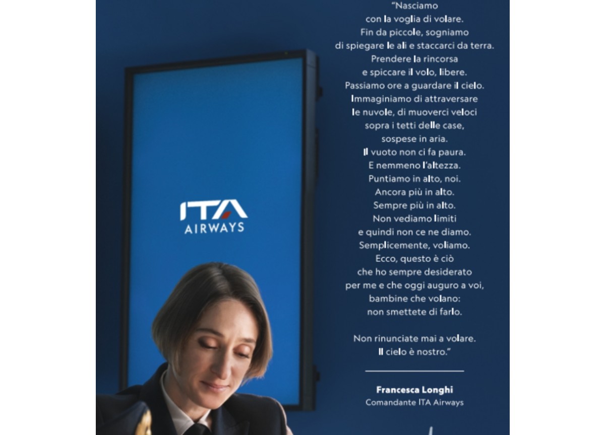 ITA Airways celebra la “Festa della Donna” con un’iniziativa dedicata ai sogni, alle ambizioni e alla determinazione delle donne nel raggiungere gli obiettivi della vita. E lo fa in modo concreto e unico, infatti testimonial d’eccezione è il Comandante Francesca Longhi, la prima donna ad aver superato i nuovi Corsi Comando di ITA Airways passando da pilota all’ambita carica di Comandante.