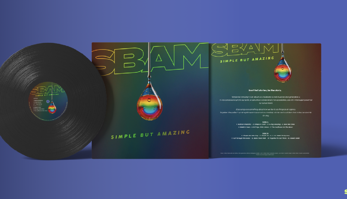 SBAM, l’agenzia creativa super-powered by JAKALA, ha lanciato un progetto musicale innovativo che va oltre la semplice comunicazione: un LP visionario intitolato SBAM – SIMPLE BUT AMAZING. Un disco che si presenta come un manifesto sonoro dei valori dell’agenzia, unendo l’intelligenza artificiale al talento umano per creare qualcosa di unico nel suo genere.