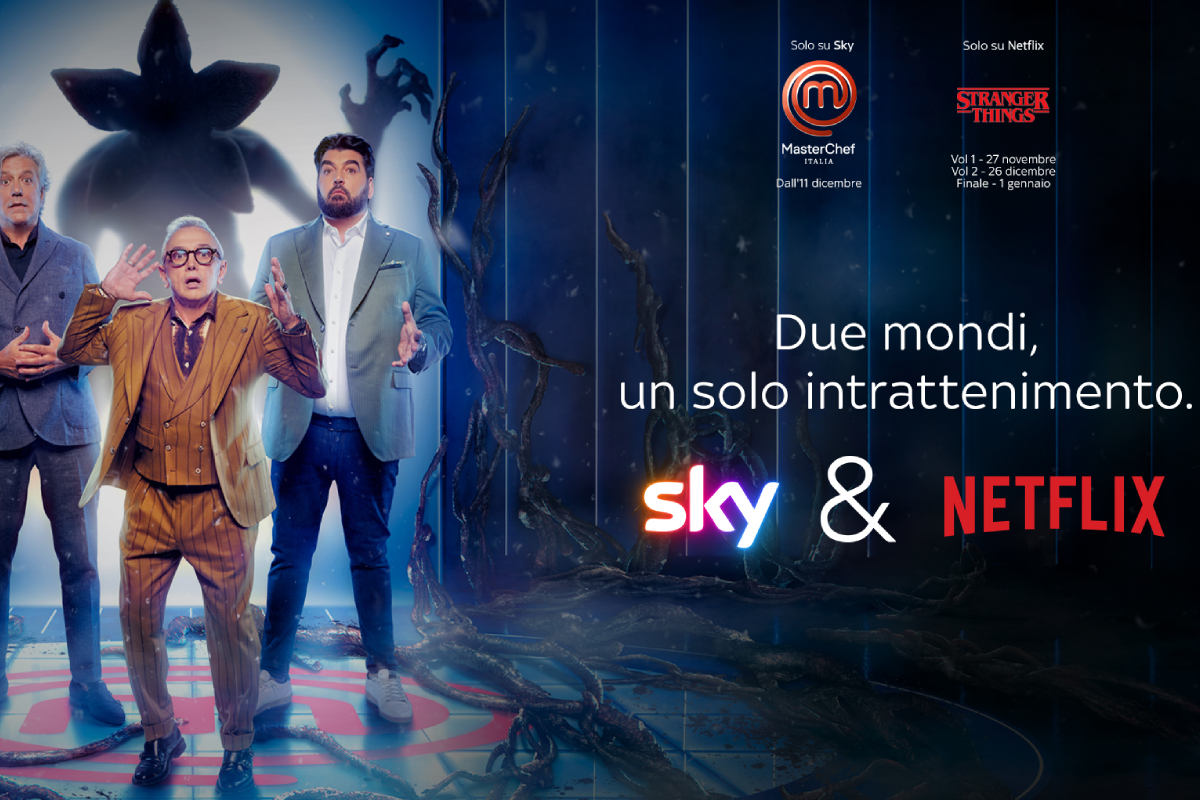 La campagna mette al centro, con un crossover dallo stile unico e innovativo, la forza dei contenuti di intrattenimento di Sky e tutto Netflix, offerti insieme a un prezzo vantaggioso, a partire dalla nuova edizione di MasterChef Italia – su Sky dall’11 dicembre – e dal primo volume della quinta stagione di Stranger Things, disponibile su Netflix dal 27 novembre. Ideato dalla Sky Creative Agency e diretto da William9, lo spot – accompagnato dal claim “Due mondi, un solo intrattenimento” – è pianificato su tutti i principali canali televisivi nazionali, oltre che in radio e sulle piattaforme Digital e Retail di Sky.