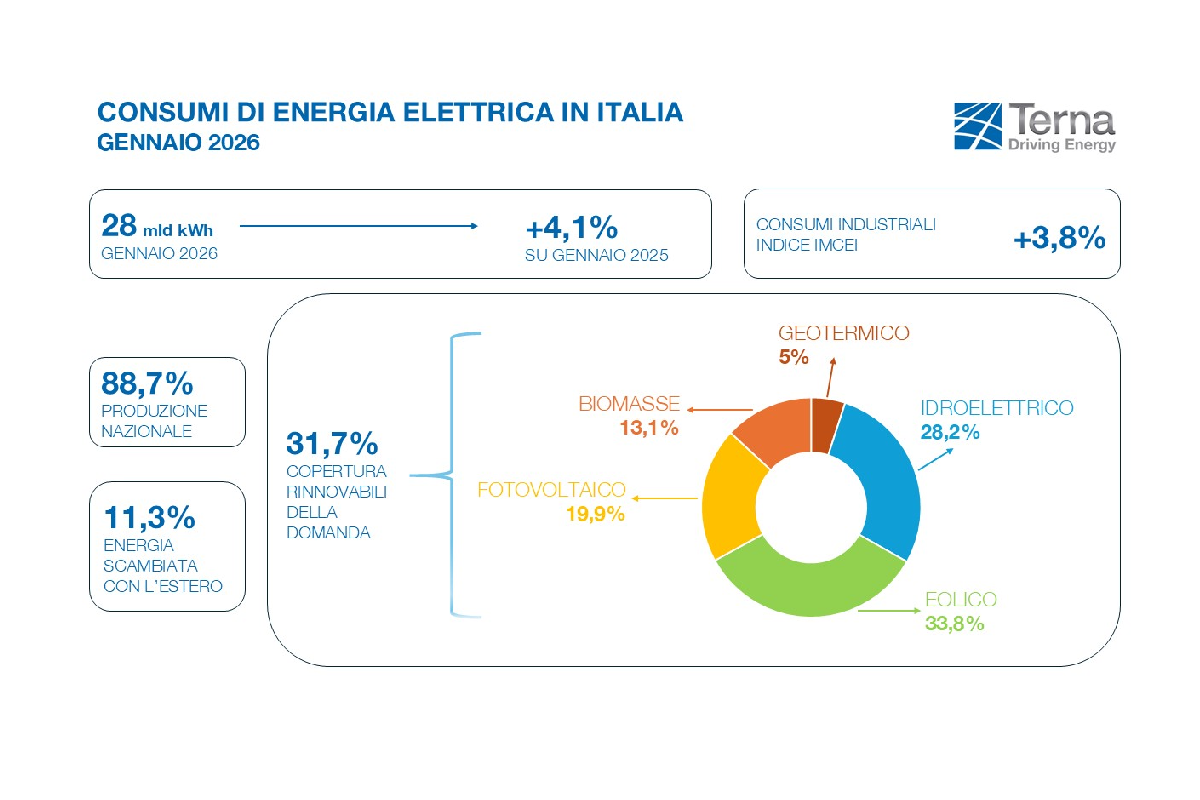 Il fabbisogno elettrico nazionale inizia il 2026 in crescita: a gennaio, il consumo di energia ha segnato un aumento del 4,1% rispetto allo stesso mese del 2025, raggiungendo quota 28 miliardi di kWh, il livello mensile più alto dal 2014. Secondo i dati di Terna, la società guidata da Giuseppina Di Foggia che gestisce la rete di trasmissione elettrica nazionale, la produzione da fonti rinnovabili come eolico e fotovoltaico è aumentata del 16% nel mese di gennaio. Questo incremento conferma il trend di ripresa della domanda elettrica avviato a settembre 2025.
