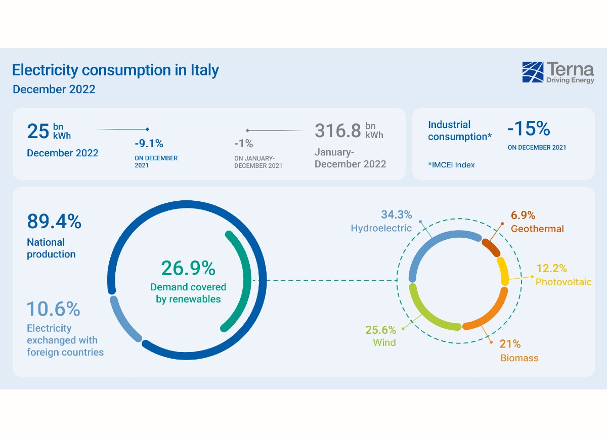 Secondo i dati raccolti da Terna, società che gestisce la rete di trasmissione nazionale, il fabbisogno di energia elettrica in Italia nel corso del 2022 è stato pari a 316,8 miliardi di kWh, un valore in flessione dell’1% rispetto al 2021. Le fonti rinnovabili hanno coperto complessivamente il 31,1% della domanda, registrando, in particolare, un marcato calo della produzione idroelettrica. Giù anche l’indice IMCEI: i consumi industriali delle imprese cosiddette ‘energivore’ sono diminuiti, infatti, del 5,4% rispetto al 2021.