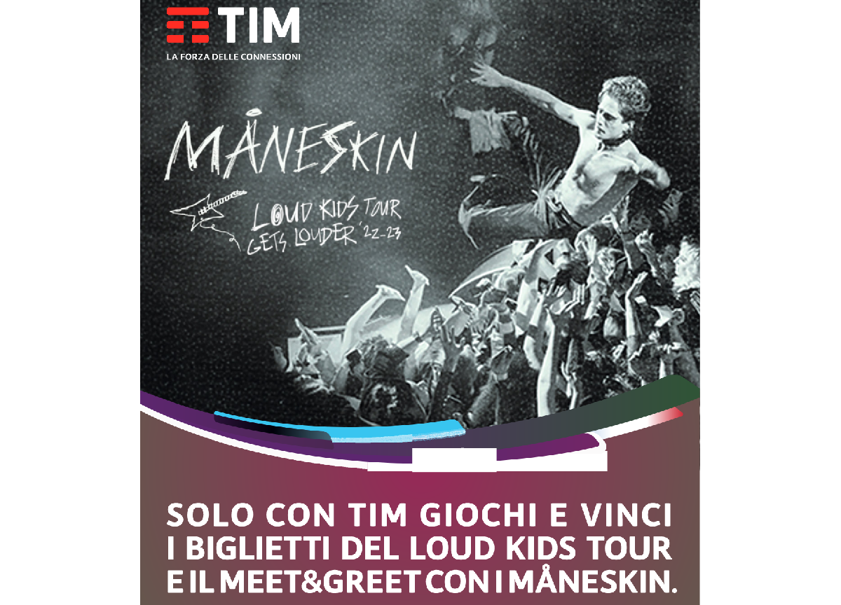 TIM è sponsor unico delle tappe italiane del ‘Loud Kids Tour’ dei Måneskin e lancia il concorso dedicato ai clienti ‘Con TIM Giochi e Vinci i biglietti del tour dei Måneskin’, che permetterà di aggiudicarsi i biglietti per assistere ad una tappa dei concerti che partiranno da Pesaro il 23 febbraio. Il contest, inoltre, darà la possibilità ai fan del gruppo musicale rock romano, ormai protagonista sulla scena mondiale, di vincere anche meet&greet in alcune serate speciali.