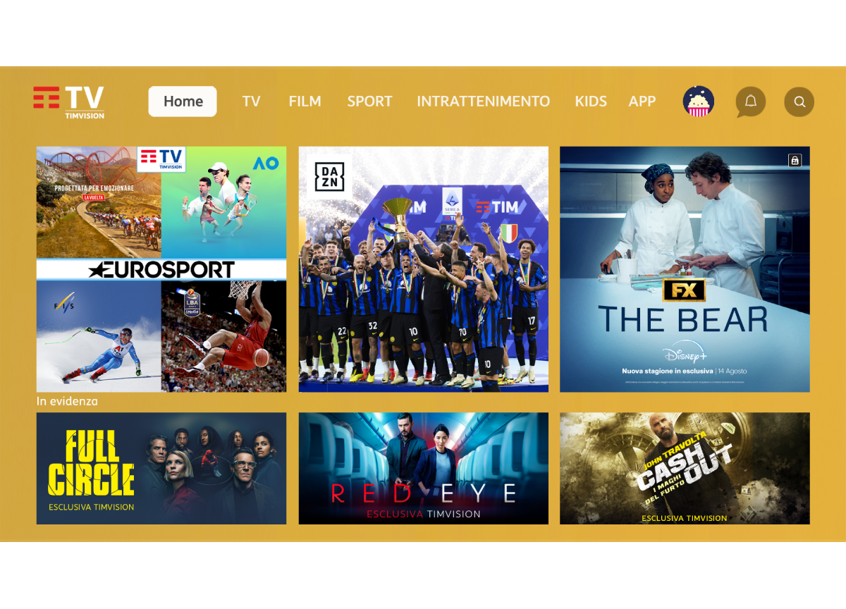 TimVision è la piattaforma streaming più completa e conveniente sul mercato italiano, l’unica che riunisce tutti i principali content brand globali – DAZN, Infinity+, discovery+, Disney+, Netflix e Prime Video – proponendo, oltre ai migliori contenuti sportivi, un ricco catalogo di film, serie tv, cartoni e show per tutta la famiglia.