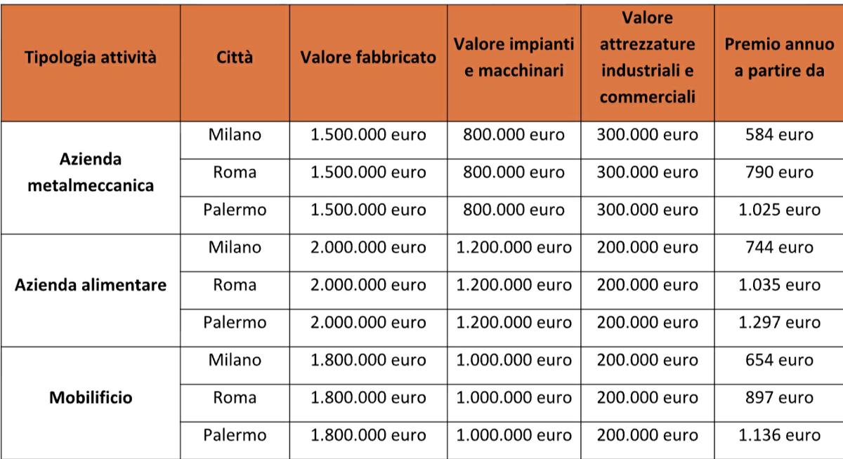 Le quotazioni per l’azienda alimentare salgono, in virtù di valori assicurati più elevati: in questo caso un terreno di 50.000 euro, un’immobile dal valore di 2 milioni di euro, attrezzature per 200.000 euro ed impianti e macchinari da 1,2 milioni di euro. La struttura posizionata a Milano deve mettere a budget un costo annuale a partire da 744 euro, a Roma 1.035 euro, mentre a Palermo 1.297 euro. Per il mobilificio (terreno 50mila euro, fabbricato 1,8 milioni di euro, attrezzature da 200.000 euro ed impianti/macchinari da 1 milione di euro), il premio annuo parte da 654 euro a Milano, 897 euro a Roma e 1.136 euro a Palermo.