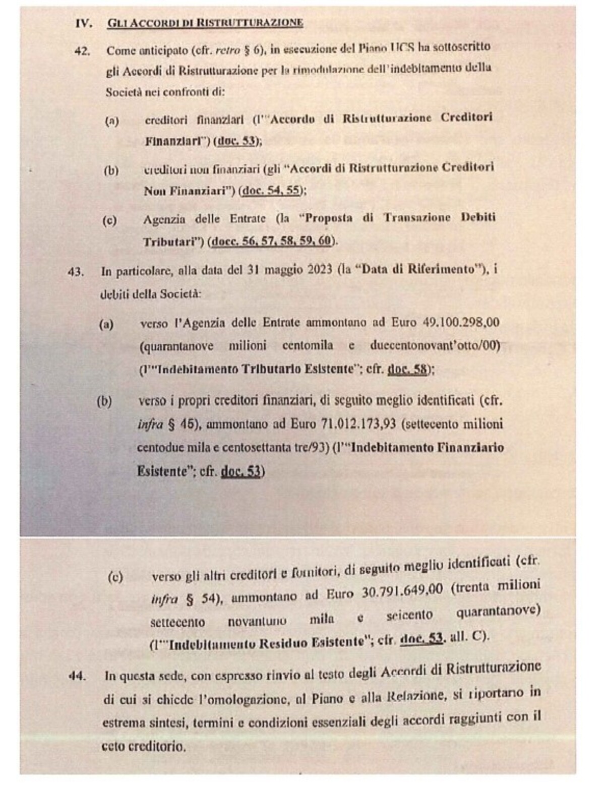 Inoltre, per quanto concerne la ristrutturazione con i creditori non finanziari per i 30,8 milioni ci sono quattro sottocategorie. Agenti e procuratori sportivi, pagati al 40% in tre anni, con adesione all’82%; fornitori chirografari, pagati al 70% in tre anni con adesione al 79%; fornitori privilegiati, pagati al 70% in tre anni con adesione al 95%, fornitori strategici nel cantiere di Bogliasco, pagati al 90% in tre anni con adesione al 93%.