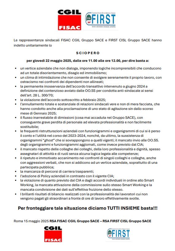 Giovedì 22 maggio 2025, dalle 11.00 alle 12.00, i lavoratori e le lavoratrici del Gruppo SACE incroceranno le braccia. La mobilitazione, indetta unitariamente dalle Rappresentanze Sindacali FISAC CGIL e FIRST CISL, nasce da un malessere profondo: accuse di vertici “sordi” al dialogo, un clima di intimidazione diffuso, accordi aziendali disattesi e un’emorragia di dimissioni mai vista prima.