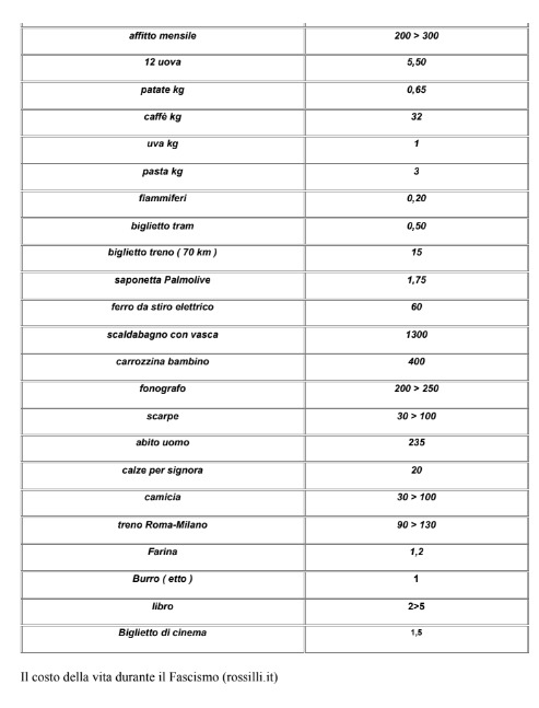 IL COSTO DELLA VITA DURANTE IL FASCISMO