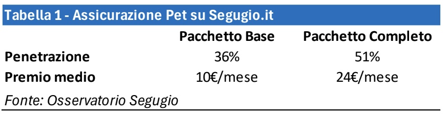 • Il pacchetto completo, che oltre alle coperture del pacchetto base allevia la famiglia dai costi relativi alle spese sanitarie ordinarie del proprio amico a 4 zampe, viene scelto dalla maggioranza (il 51%) degli utenti su Segugio.it, con un premio medio di 24 euro al mese.