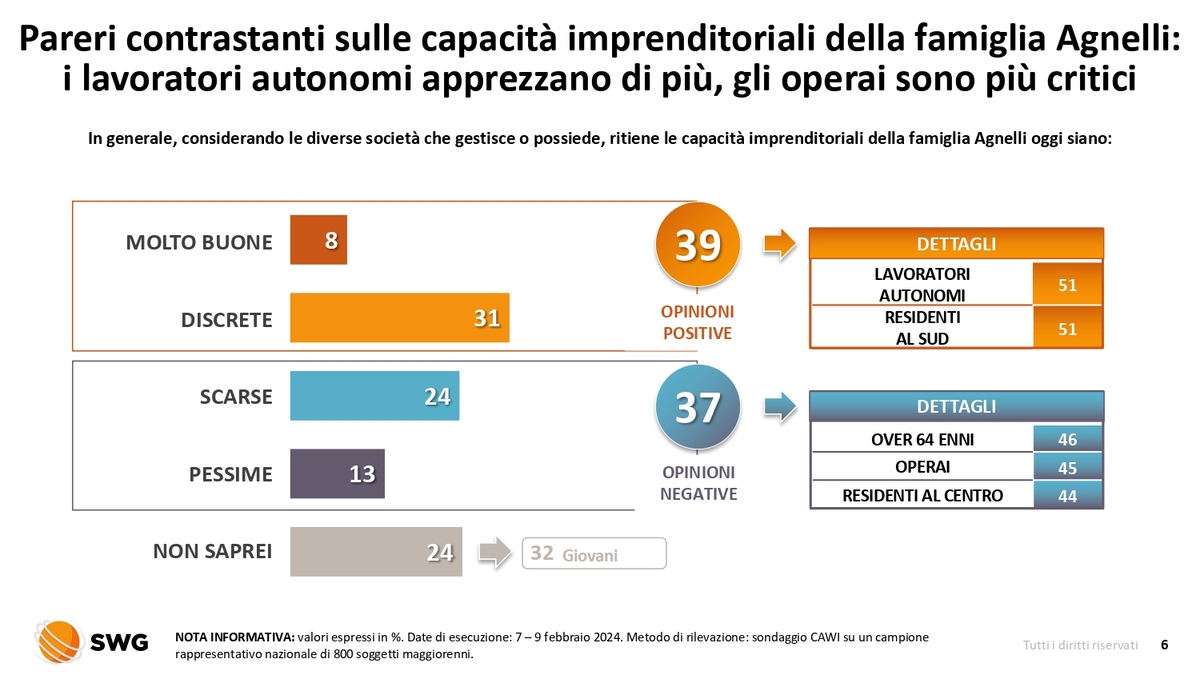 La storia della Fiat è stata caratterizzata da un susseguirsi di polemiche politiche, spesso derivanti da logiche di mercato che, pur essendo cruciali per l'azienda, hanno causato tensioni con le esigenze occupazionali del Paese. Oggi, con Stellantis, la situazione non sembra cambiata: sebbene l'azienda rimanga rilevante per l'industria e l'occupazione italiana, sorgono dubbi sulla sua efficienza e modernità tecnologica, oltre che sul trattamento riservato ai lavoratori. Le dichiarazioni dei vertici di Stellantis riguardo ai potenziali tagli occupazionali causati dalla mancanza di incentivi per l'acquisto di auto elettriche sono stati accolti con forte dissenso da parte dell'opinione pubblica, che nutre anche dubbi sull'adozione diffusa dei veicoli elettrici. La questione coinvolge anche la famiglia Agnelli, la cui immagine divide il Paese: mentre sostenitori e critici sono in equilibrio, i lavoratori autonomi tendono a essere più favorevoli rispetto agli operai, che esprimono giudizi più negativi.