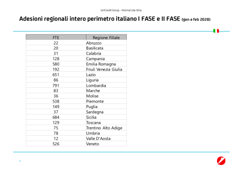 Dal punto di vista invece regionale, la maggior parte del contributo arriverà dalle filiali delle Regioni del Nord (2.800), in primis della Lombardia (791) contro le 941 uscite dalla rete del Centro Italia e i 1.107 esodi dagli sportelli del Sud, con un ruolo di primo piano della Sicilia (684). La Regione registra il numero di uscite più alto in valore assoluto, secondo solo alla Lombardia ed eredità della vecchia fusione con Capitalia del 2007.