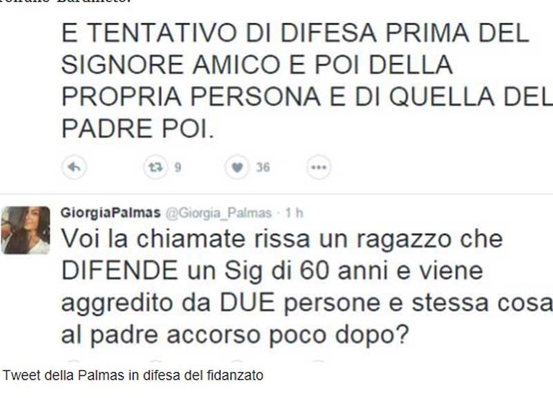 In difesa di Vittorio Brumotti scende in campo la fidanzata, Giorgia Palmas: su Twitter la ex velina contesta la definizione di rissa per quello che è successo martedì sera all'inviato di Striscia la notizia - e campione di trial bike - sulla provinciale Toirano-Bardineto.