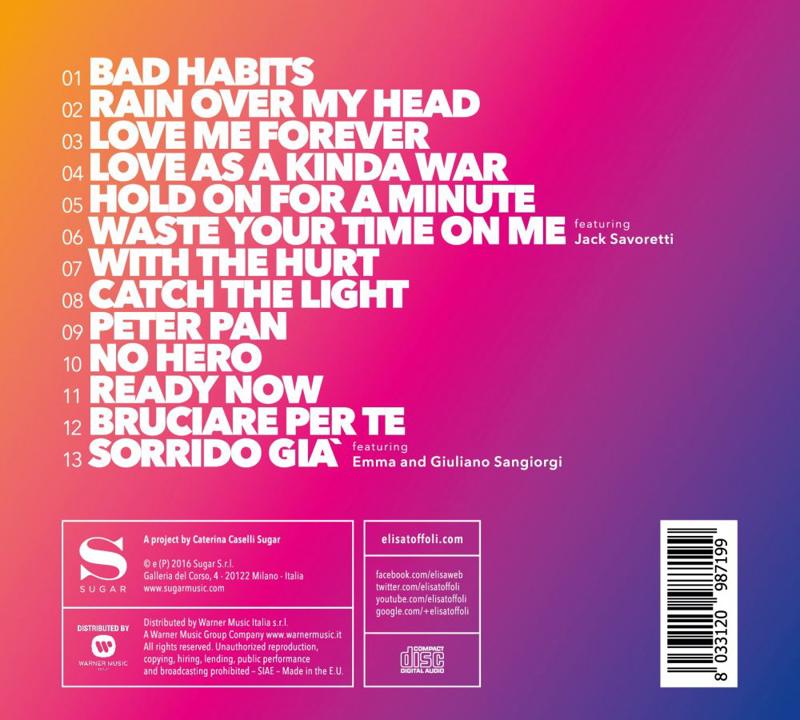 Questa la tracklist di “ON” (pubblicato da Sugar): “Bad Habits”; “Rain Over My Head”; “Love Me Forever”; “Love As A Kinda War”; “Hold On For A Minute”; “Waste Your Time On Me” feat. Jack Savoretti; “With The Hurt”; “Catch The Light”; “Peter Pan”; “No Hero”; “Ready Now”; “Bruciare Per Te”; “Sorrido Già” feat. Emma e Giuliano Sangiorgi.