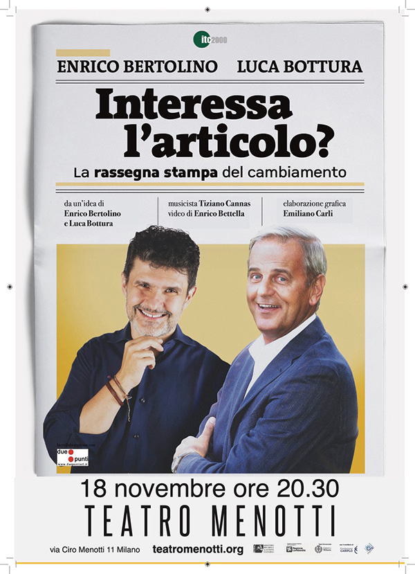 Lunedì 18 novembre, al Teatro Ciro Menotti di Milano alle ore 20.30, arriva Interessa l’articolo, di e con Enrico Bertolino e Luca Bottura, che daranno vita ad uno spettacolo in cui l’attualità, la politica, il costume e la satira si contamineranno danneggiandosi a vicenda. Dopo il grande successo radiofonico, il format torna a teatro per il secondo anno consecutivo, unendo le doti narrative e comiche di Bertolino alla pungente satira di Bottura.