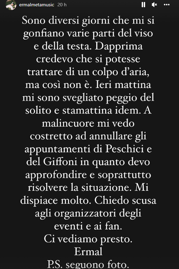 Ha poi condiviso sui social anche due foto in cui mostra i gonfiori che però hanno subito preoccupato i fan. Successivamente Ermal ha cercato di rincuorarli scrivendo: "Tranquilli ragazzi, riposo e cortisone faranno il loro dovere. Ci vediamo fra qualche giorno".