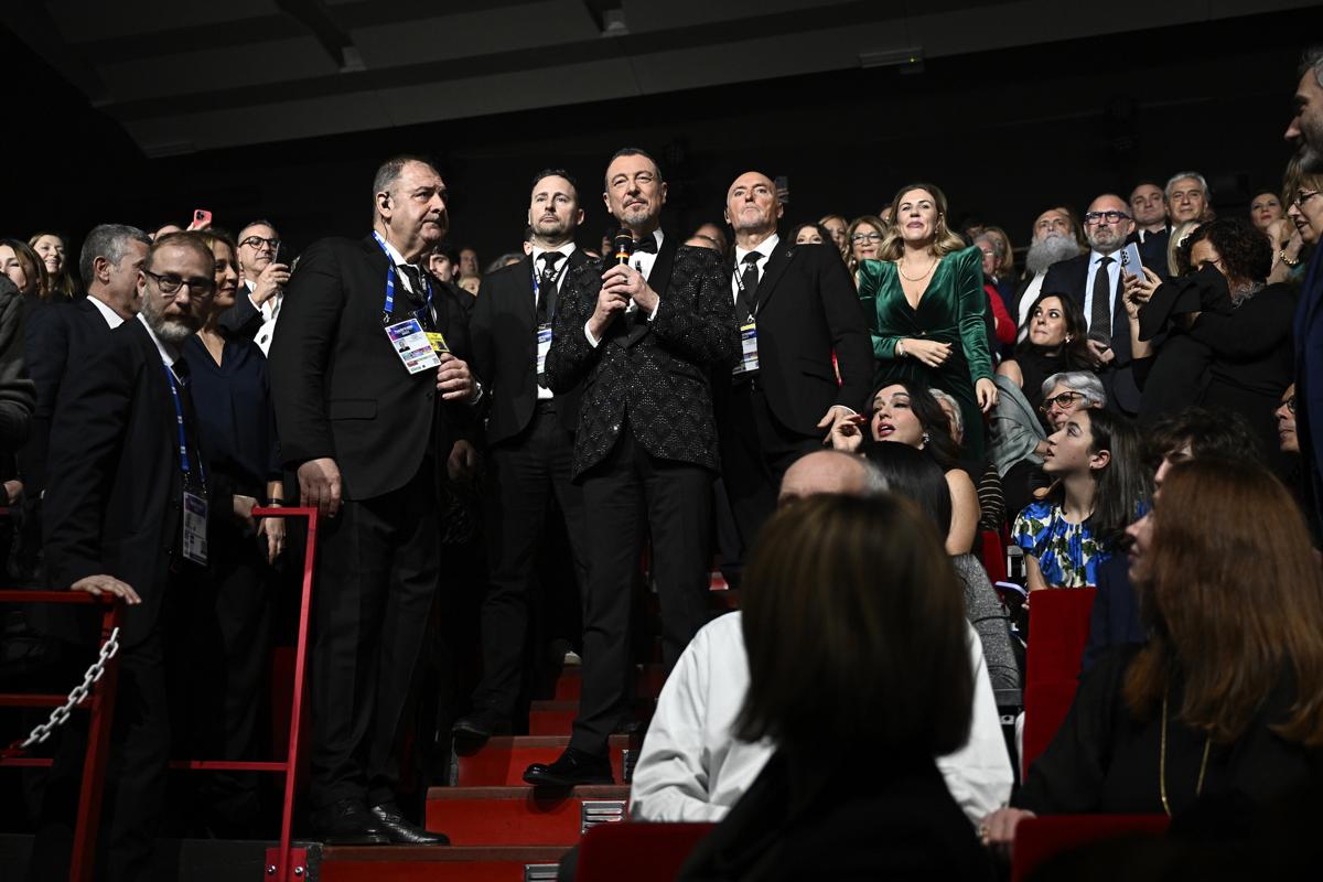 Teatro Ariston in piedi per l’inno di Mameli. Si apre il sipario della serata finale del festival di Sanremo. In platea ci sono il sottosegretario alla Presidenza del Consiglio con delega all’Informazione e all’Editoria, Alberto Barachini, il sottosegretario alla Difesa, Isabella Rauti, il presidente della commissione di Vigilanza Rai, Barbara Floridia, il capo di Stato Maggiore dell’Esercito Italiano, generale Piero Serino, e il consigliere d’amministrazione della Rai, Simona Agnes. A seguire la banda lascia il palco da platea eseguendo la Marcia d’Ordinanza.