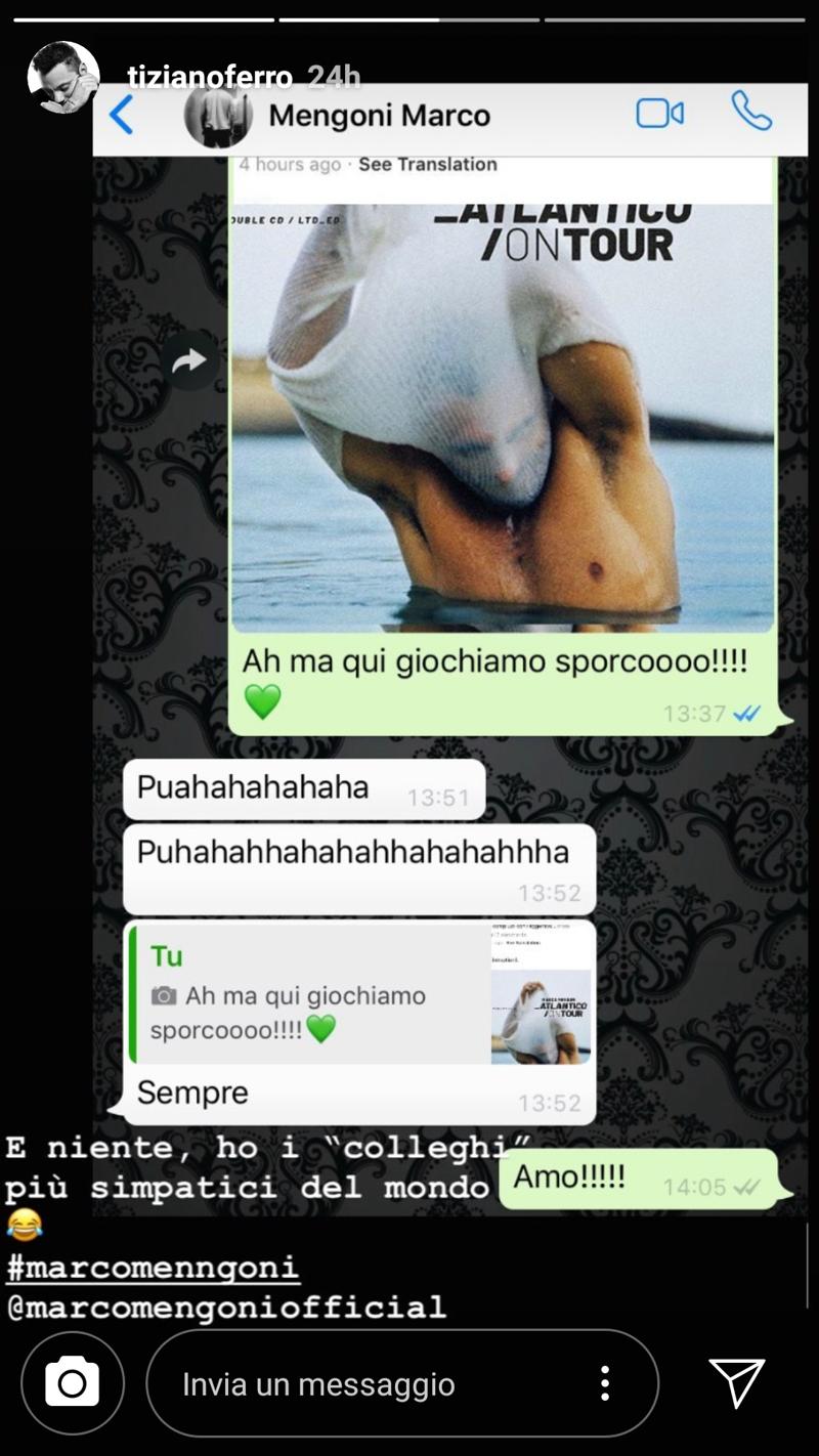Tiziano Ferro ha pubblicato nelle Instagram Stories lo screenshot di una chat privata con Marco Mengoni, suo collega. I due scherzano sull’immagine della locandina scelta per il tour di Mengoni. Nello scatto il cantante di Viterbo mette in mostra pettorali e muscoli delle braccia mentre si toglie la maglietta in mezzo al mare.