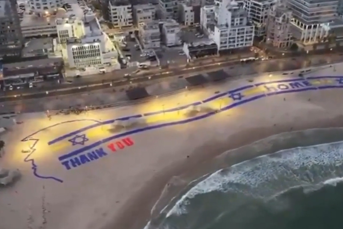 Poco prima dell’atterraggio a Tel Aviv, l’Air Force One di Donald Trump ha sorvolato una scritta gigante “Grazie” disegnata sulla sabbia in giallo e blu